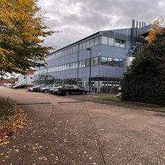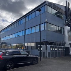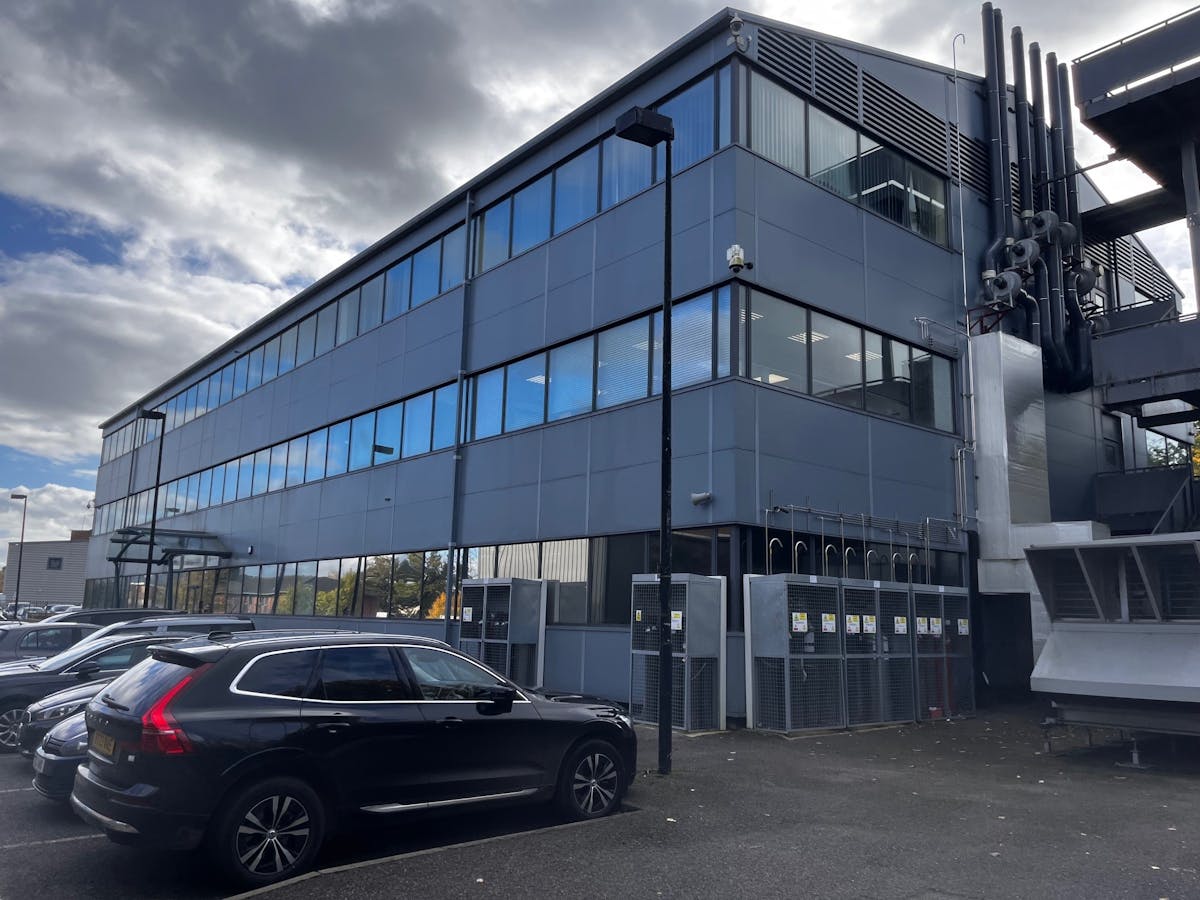 The property is a modern, three storey building with cladding and glazed elevations and surface parking on an established business park.