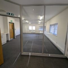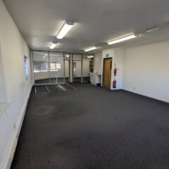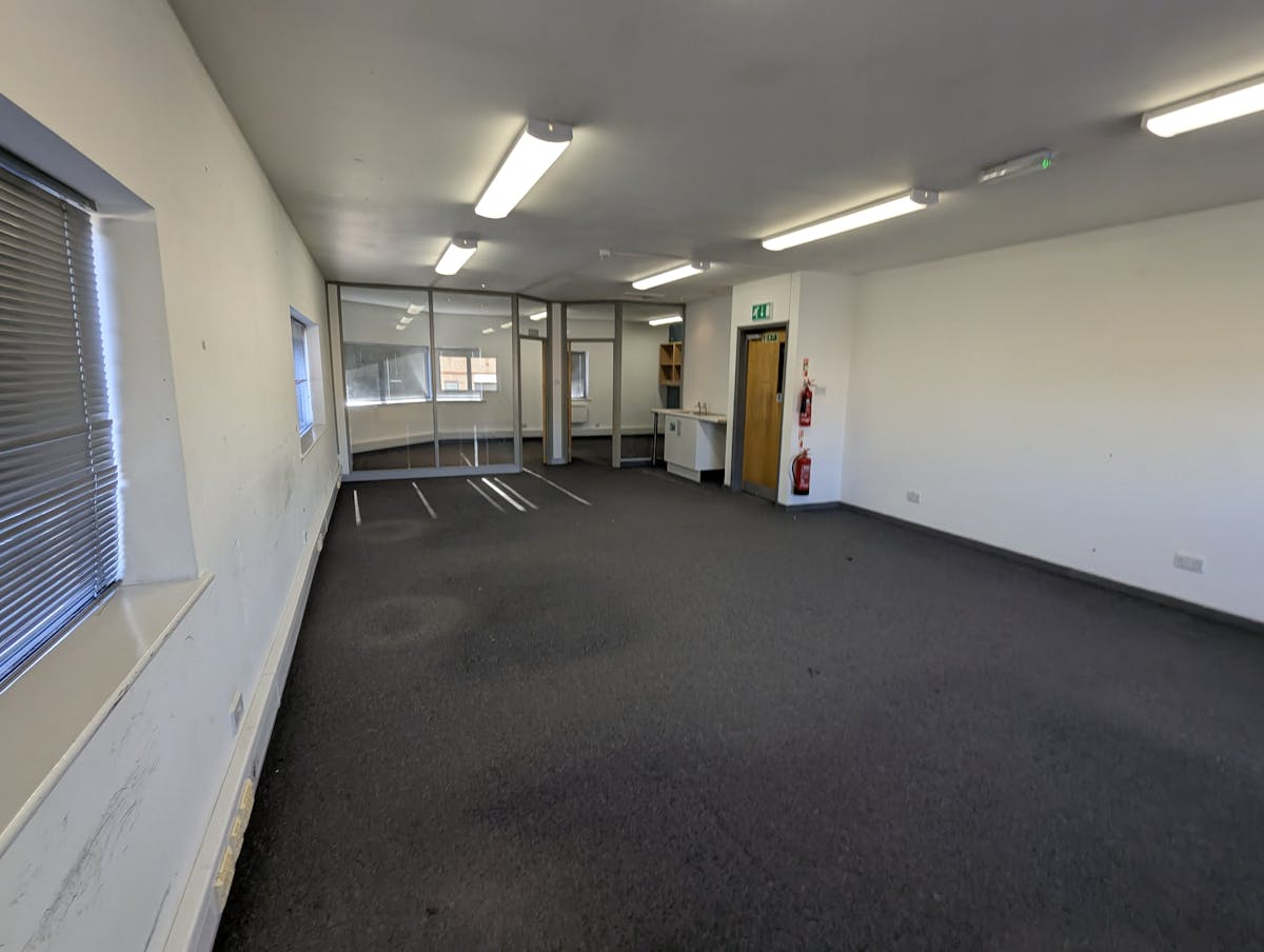 The property comprises ground floor warehouse/workshop space with first floor offices. The unit is accessed via a set of double doors.