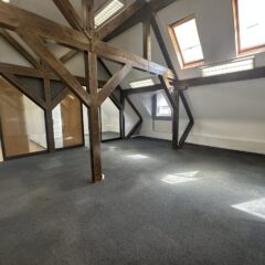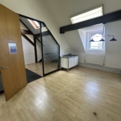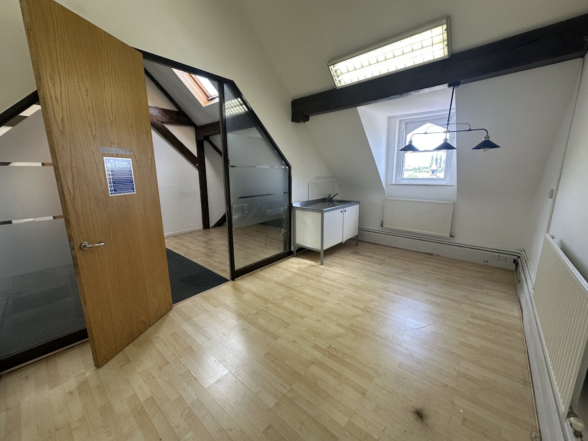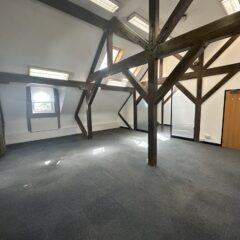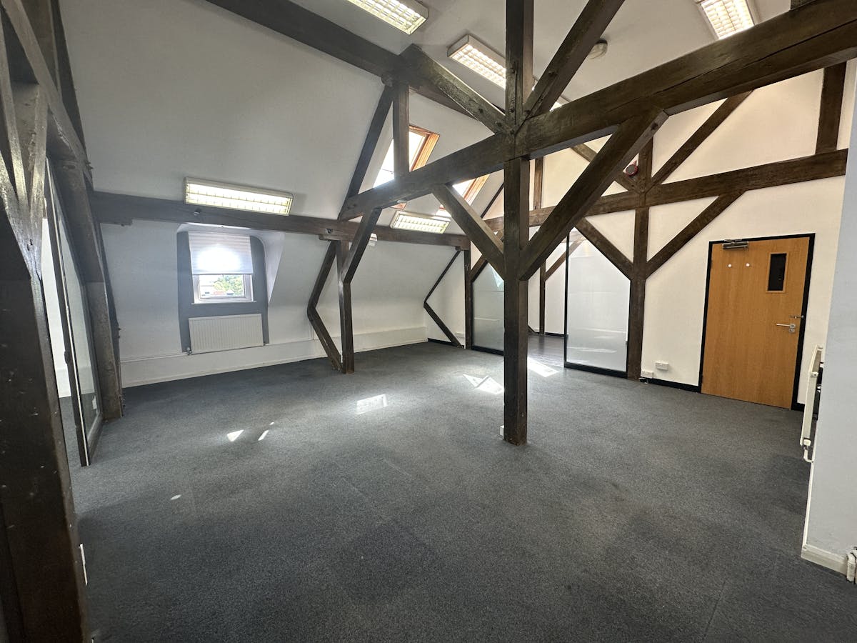 The available accommodation is a third-floor office suite, accessible via lift, which is predominantly open plan and includes a meeting room and a kitchenette. It is carpeted throughout and benefits from gas central heating and access to communal WCs. The suite features exposed beams and skylights, providing a bright, characterful workspace.