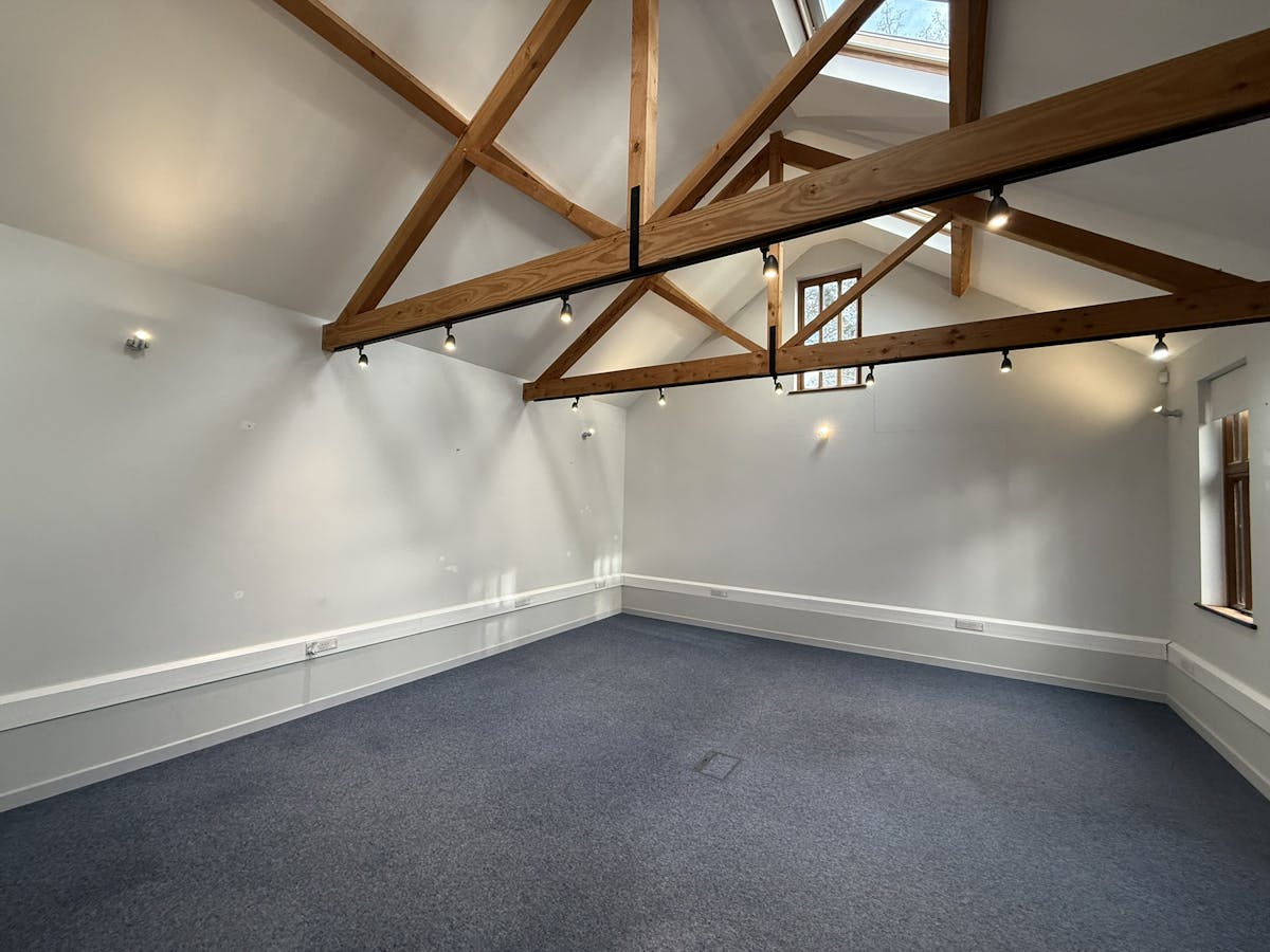 Internally, the space benefits from exposed timber trusses, rooflights, surface-mounted lighting and comfort cooling to sections. The premises further benefits from kitchen facilities and WC provision, together with convenient access to on-site parking with 9+ spaces and external amenity space.